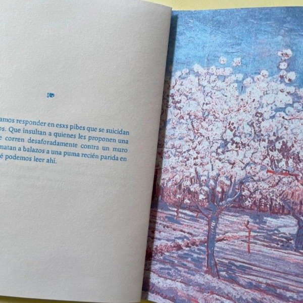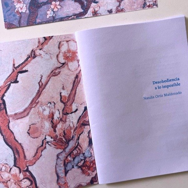 Insubordinación a lo imposible de Natalia Ortiz Maldonado es un ensayo/poema/manifiesto sobre la resistencia y la desobediancia en épocas de desastre, con pinturas de Van Gogh de la serie Almendros en flor, intervenidos. Plaqueta de 24 pp. 17,5 x 12,5 cm. Impresa en risografía dos tintas.